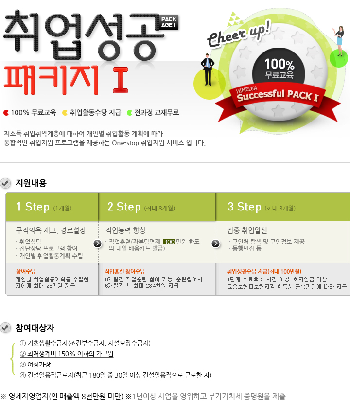 하이미디어 [국비무료] 취업성공패키지 I Post. 2013.04.22 참여대상자 ① 기초생활수급자(조건부수급자, 시설보장수급자) ② 최저생계비 150% 이하의 가구원 ③ 여성가장 ④ 영세자영업자(연 매출액 8천만원 미만) ⑤ 건설일용직근로자(최근 180일 중 30일 이상 건설일용직으로 근로한 자)