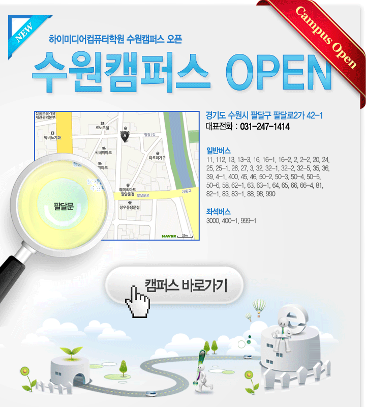 하이미디어 [종료] 수원캠퍼스 오픈하였습니다. Post. 2010.11.15 하이미디어컴퓨터학원 수원캠퍼스 오픈 기념 이벤트 1. 수강료 할인 40%~30%할인 : 오픈 기념 행사기간 접수하시는 모든분들께 특별할인을 해드립니다. 2. 온라인 동영상 강좌 무료수강 : 애듀패스 온라인 강좌 3개월 VIP무료수강을 하실 수 있습니다.